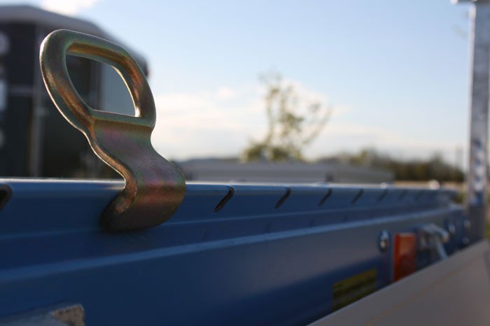 Der gesamte Bodenrahmen ist als durchgehendes Zurrprofil gekantet. In diesem Profil befinden sich im Abstand von nur 10 cm präzise Bohrungen, in die sich Gurthaken mit Magnetfixierung flexibel einhängen lassen. Mit dem Schließen der Bordwand wird der Haken automatisch gesichert – für maximale Sicherheit bei minimalem Aufwand.