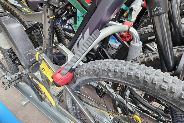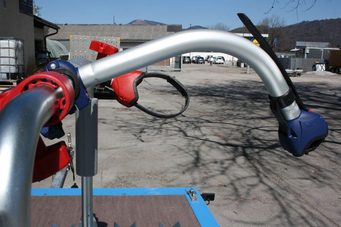 Die Fahrräder werden mit Fiamma Fahrradhaltearmen am stabil ausgeführten U-Bügel sowie mit Textilspanngurten an der Fahrradfelge gesichert